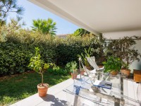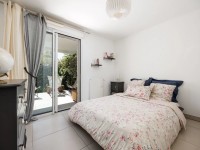 Une grande entrée, deux chambres dont une donnant sur la terrasse et le jardin, un séjour donnant également sur la terrasse-jardin, une cuisine ouverte équipée, une salle de douche avec WC.