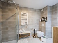 Une grande entrée, deux chambres dont une donnant sur la terrasse et le jardin, un séjour donnant également sur la terrasse-jardin, une cuisine ouverte équipée, une salle de douche avec WC.